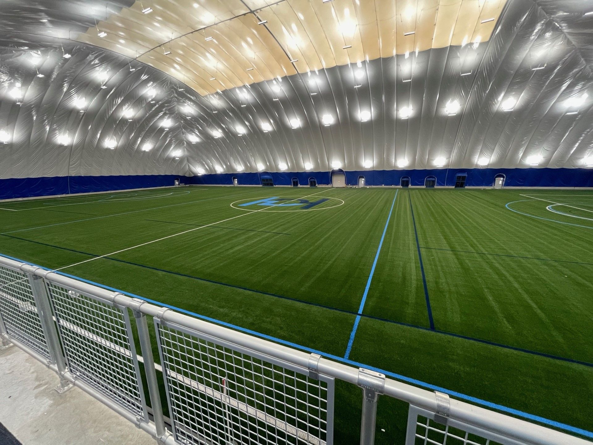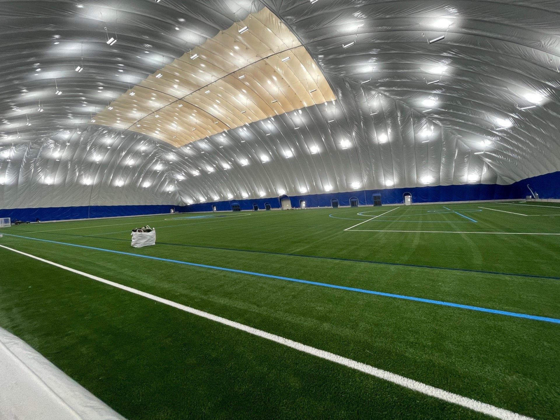 - This building is an air supported structure covering athletic fields. The peak of the dome rises to 82’. It has air lock front entry with a set of three revolving doors at the entry. There is a reception area, offices and lavs/ locker rooms and a viewing area on the mezzanine which has locker rooms and lavs as well. The building has enough area to cover three regulation soccer fields.