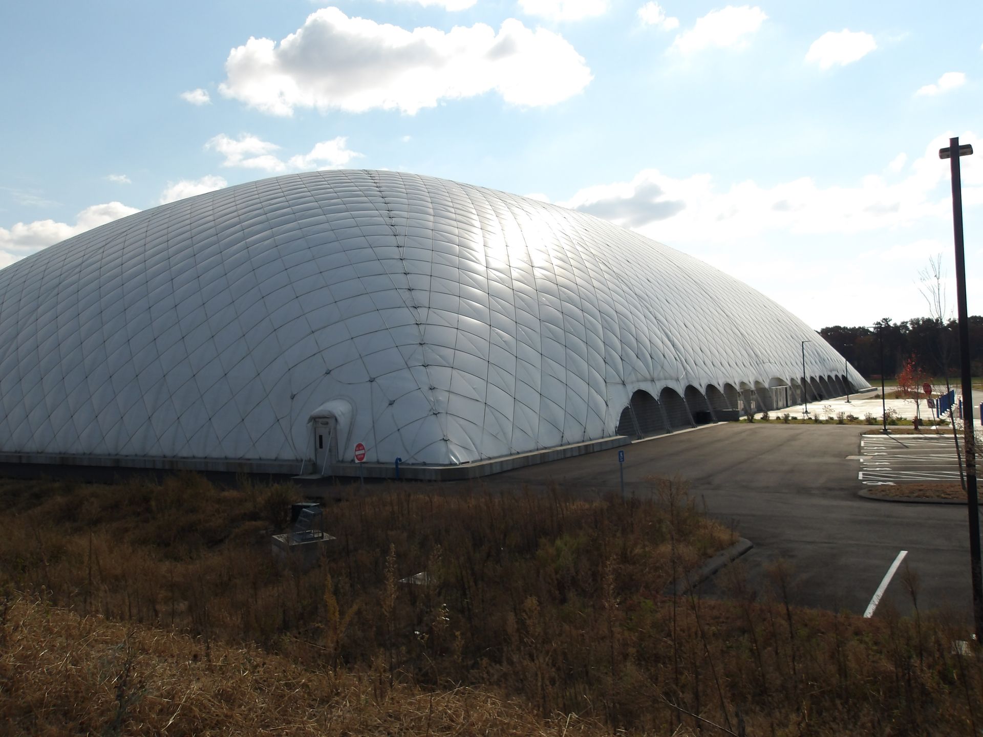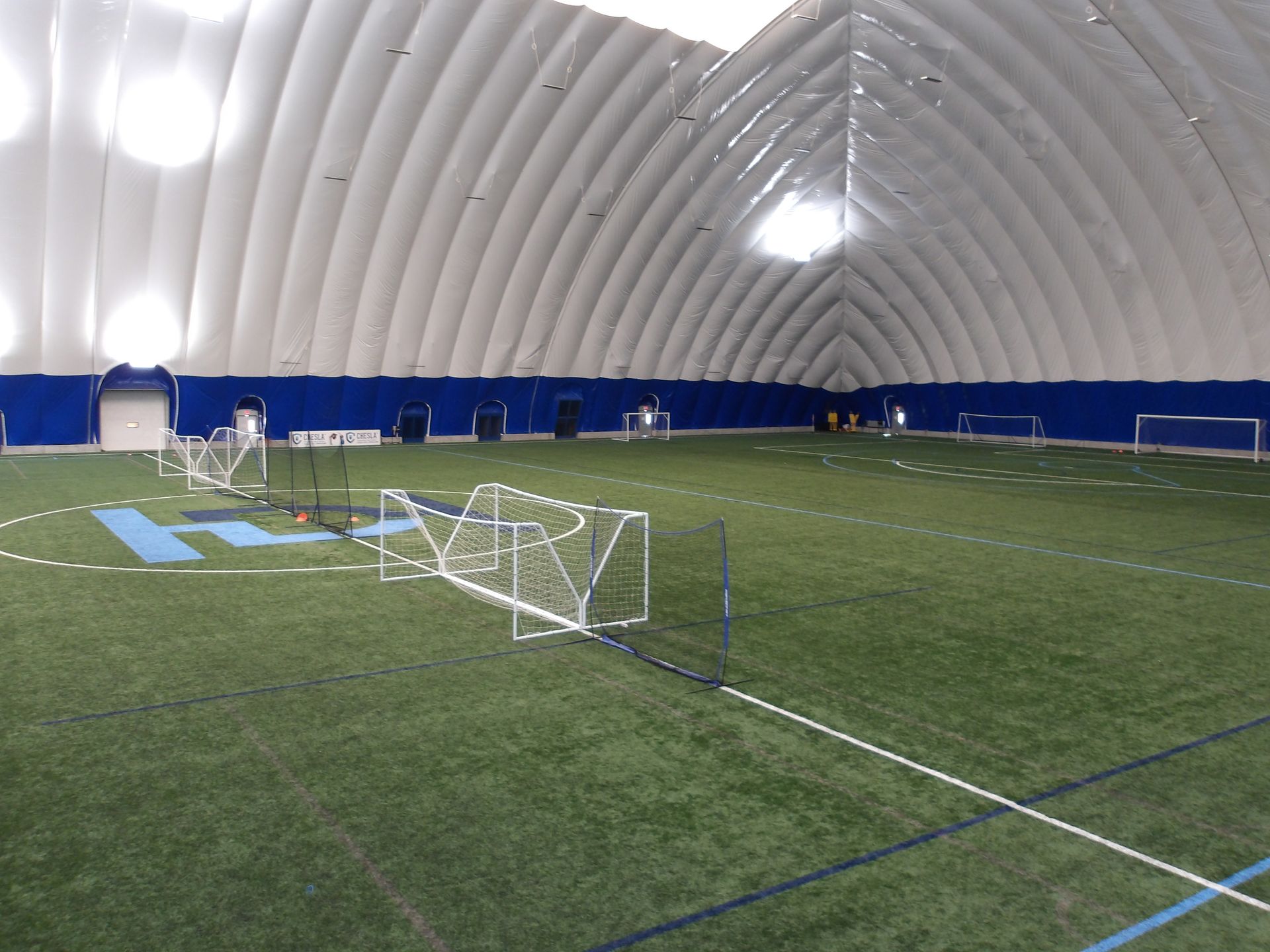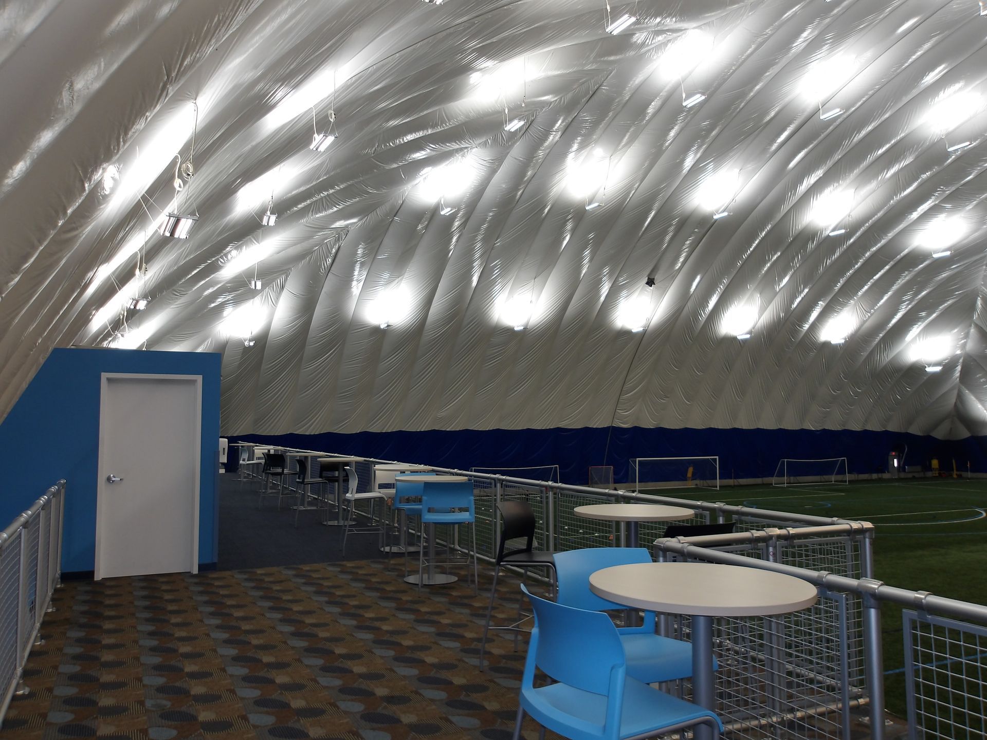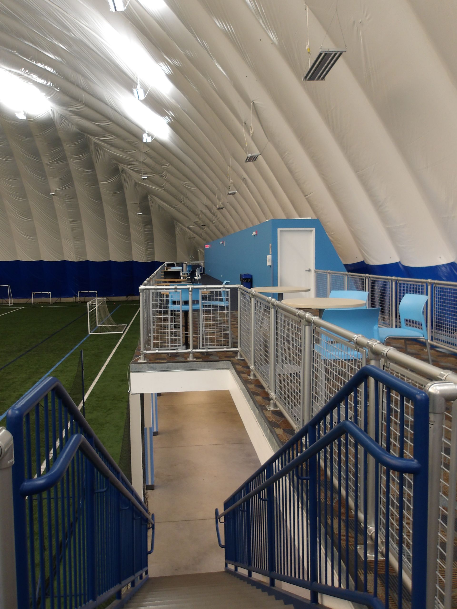 - This building is an air supported structure covering athletic fields. The peak of the dome rises to 82’. It has air lock front entry with a set of three revolving doors at the entry. There is a reception area, offices and lavs/ locker rooms and a viewing area on the mezzanine which has locker rooms and lavs as well. The building has enough area to cover three regulation soccer fields.