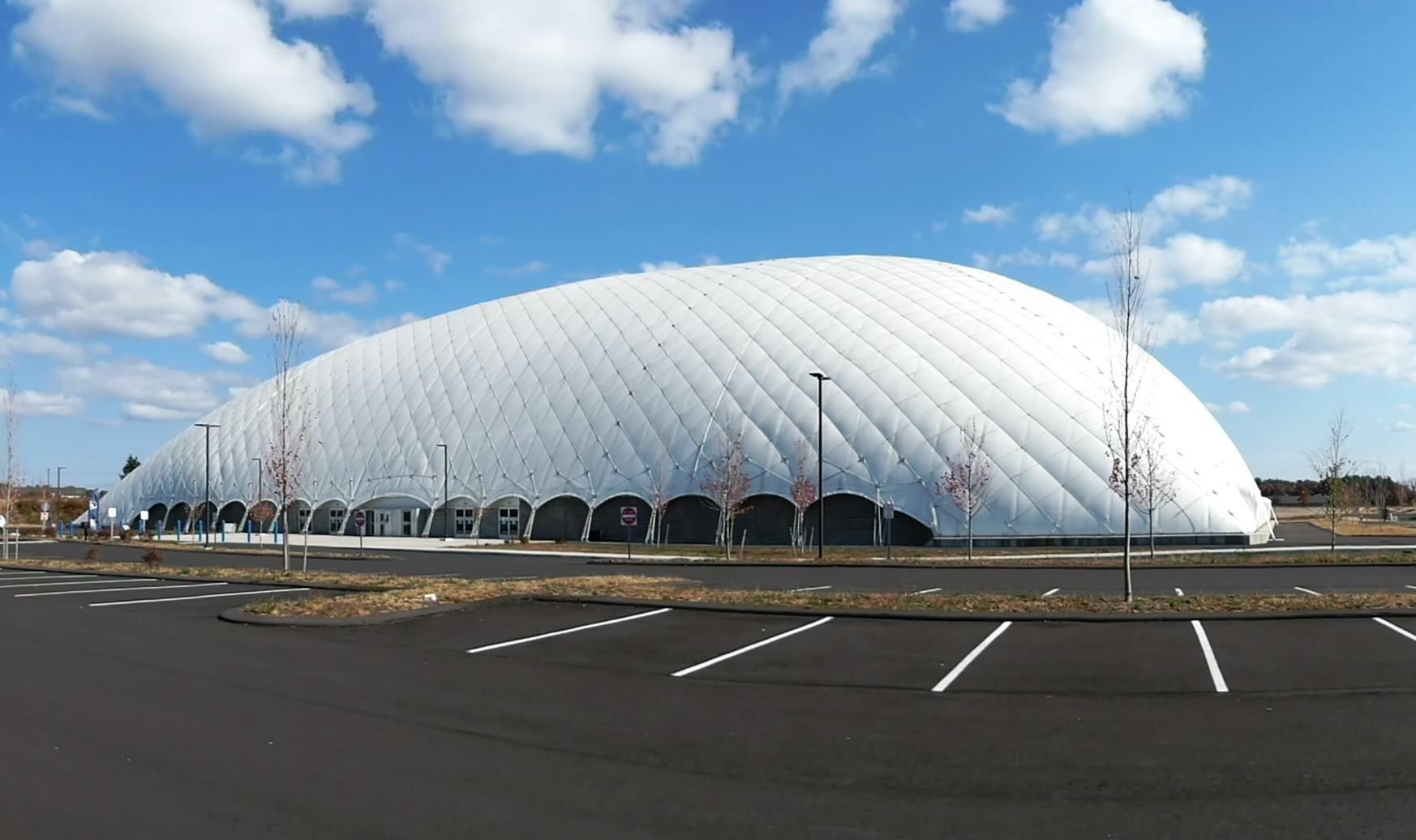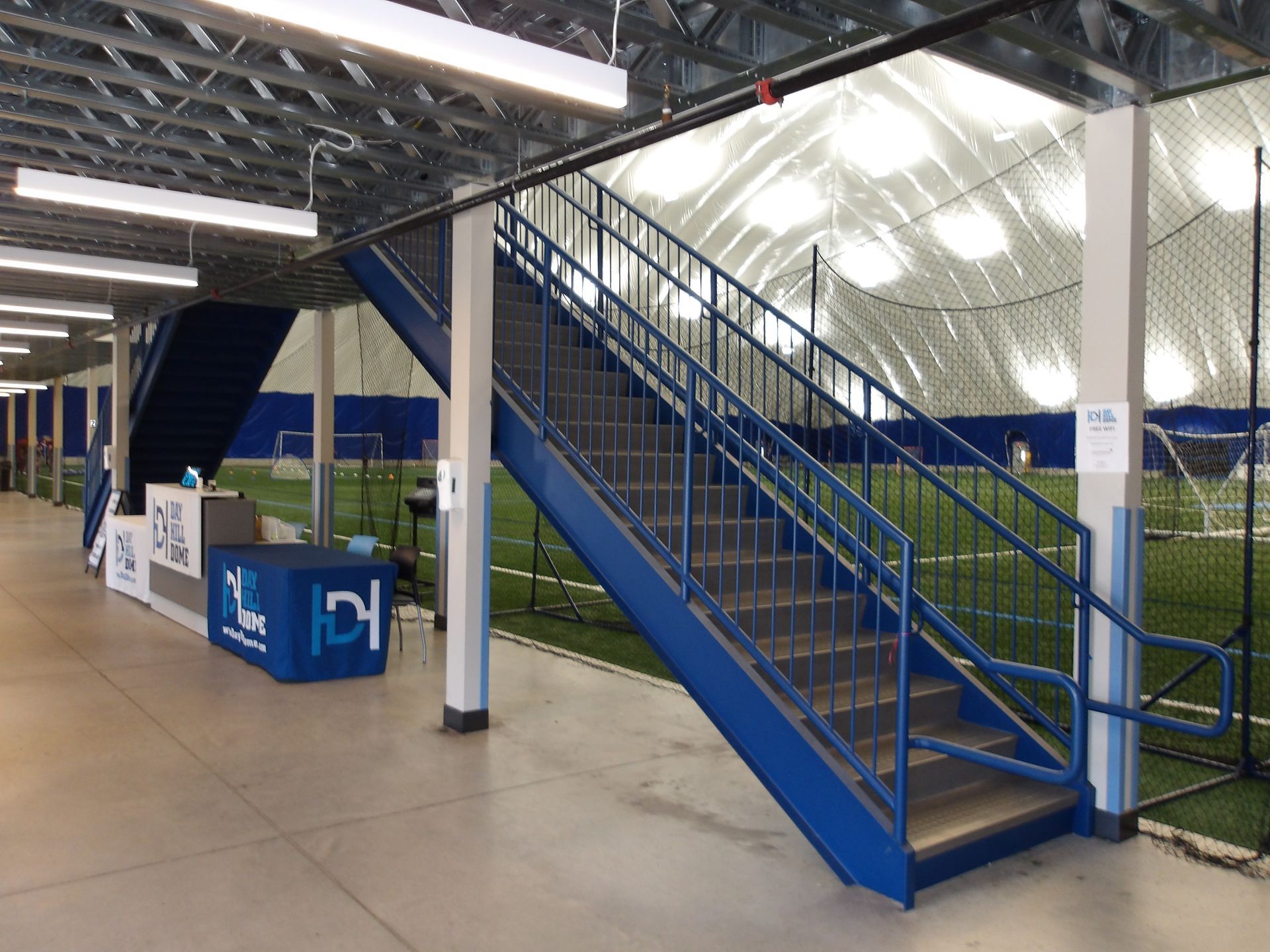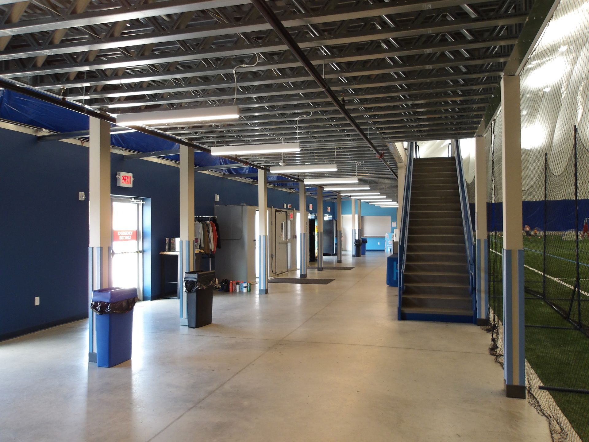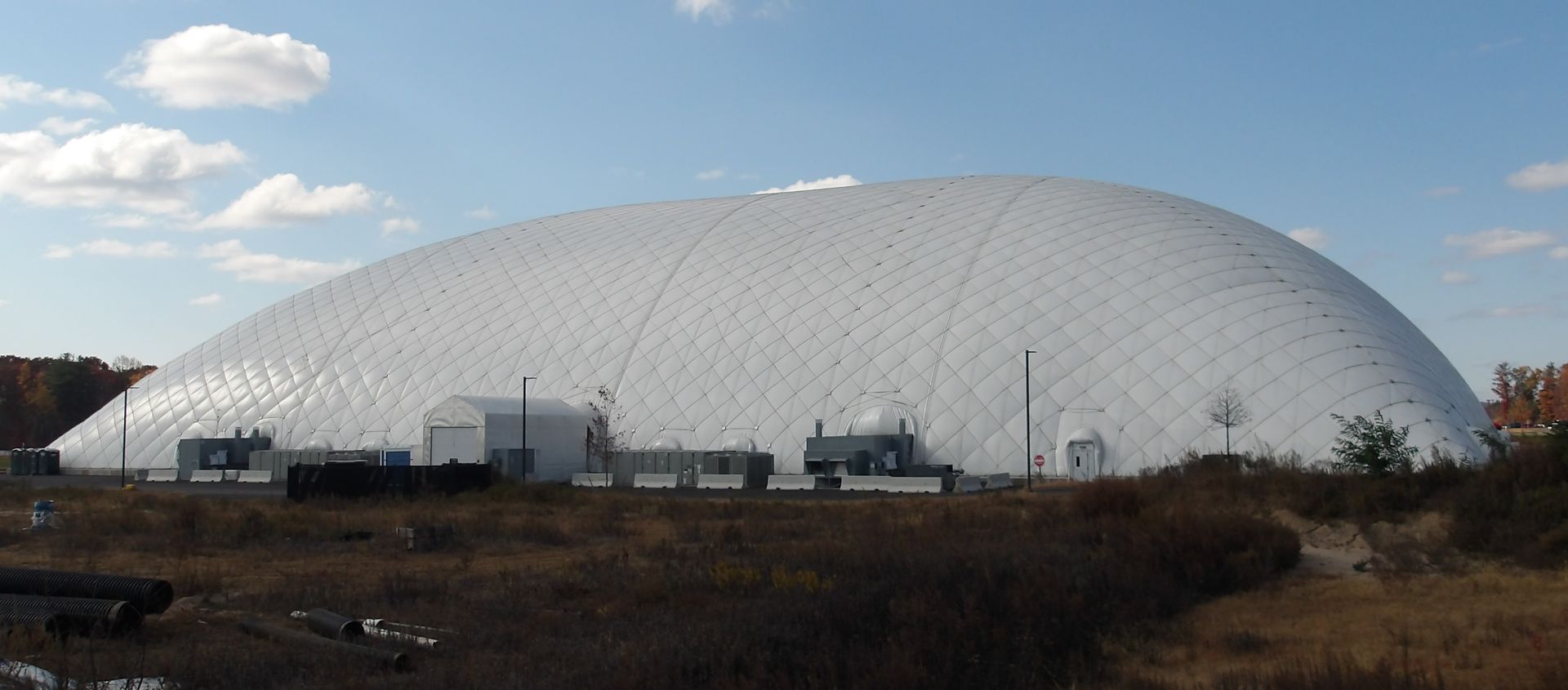 - This building is an air supported structure covering athletic fields. The peak of the dome rises to 82’. It has air lock front entry with a set of three revolving doors at the entry. There is a reception area, offices and lavs/ locker rooms and a viewing area on the mezzanine which has locker rooms and lavs as well. The building has enough area to cover three regulation soccer fields.