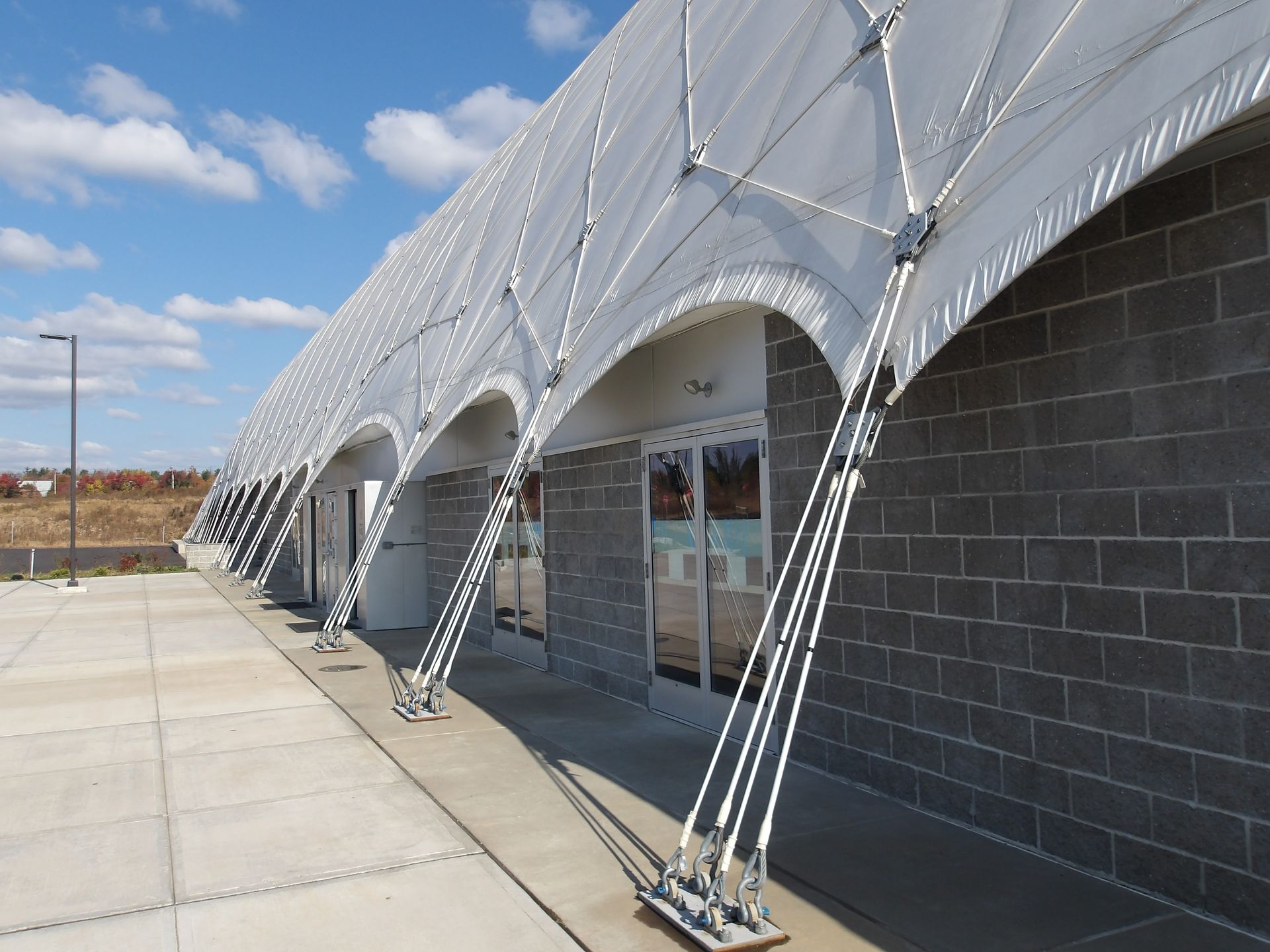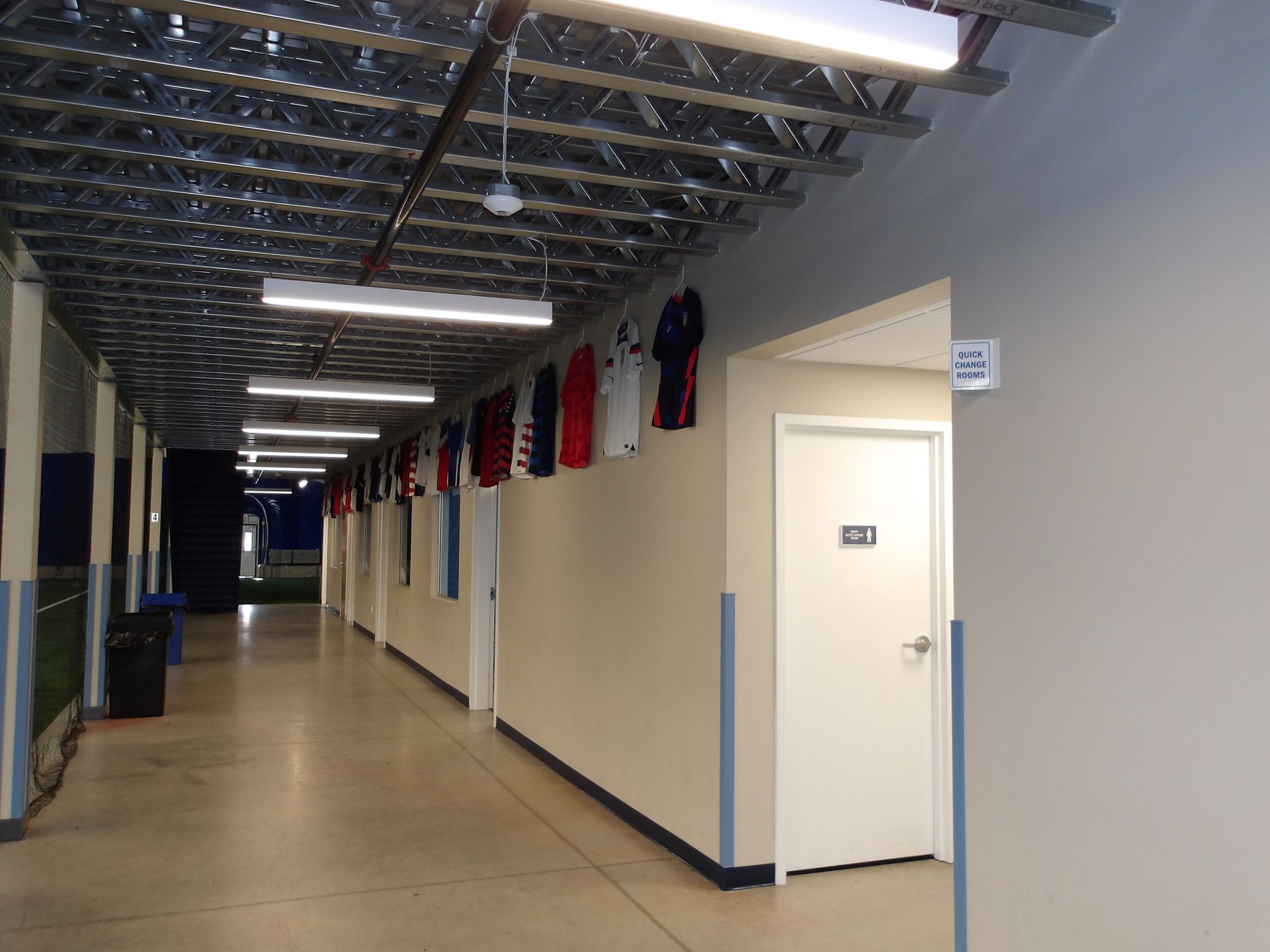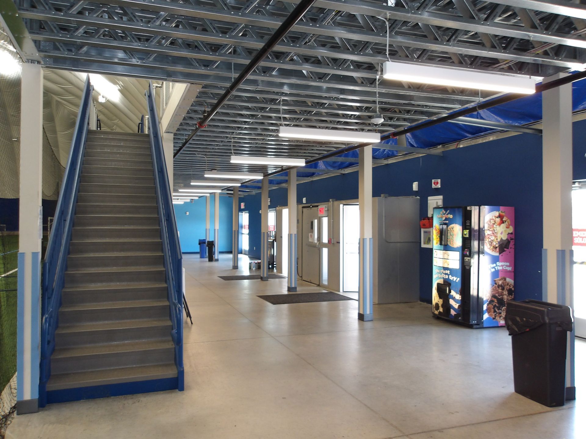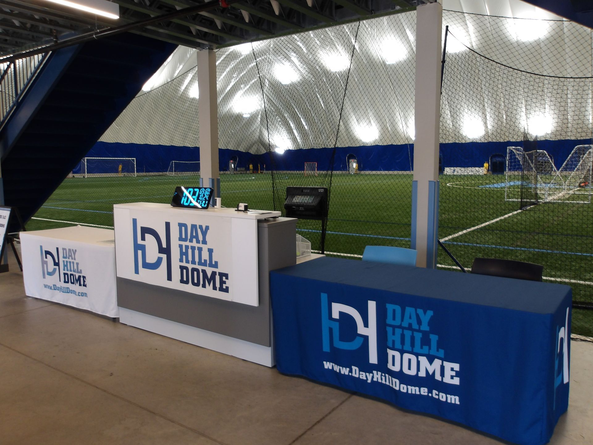 - This building is an air supported structure covering athletic fields. The peak of the dome rises to 82’. It has air lock front entry with a set of three revolving doors at the entry. There is a reception area, offices and lavs/ locker rooms and a viewing area on the mezzanine which has locker rooms and lavs as well. The building has enough area to cover three regulation soccer fields.