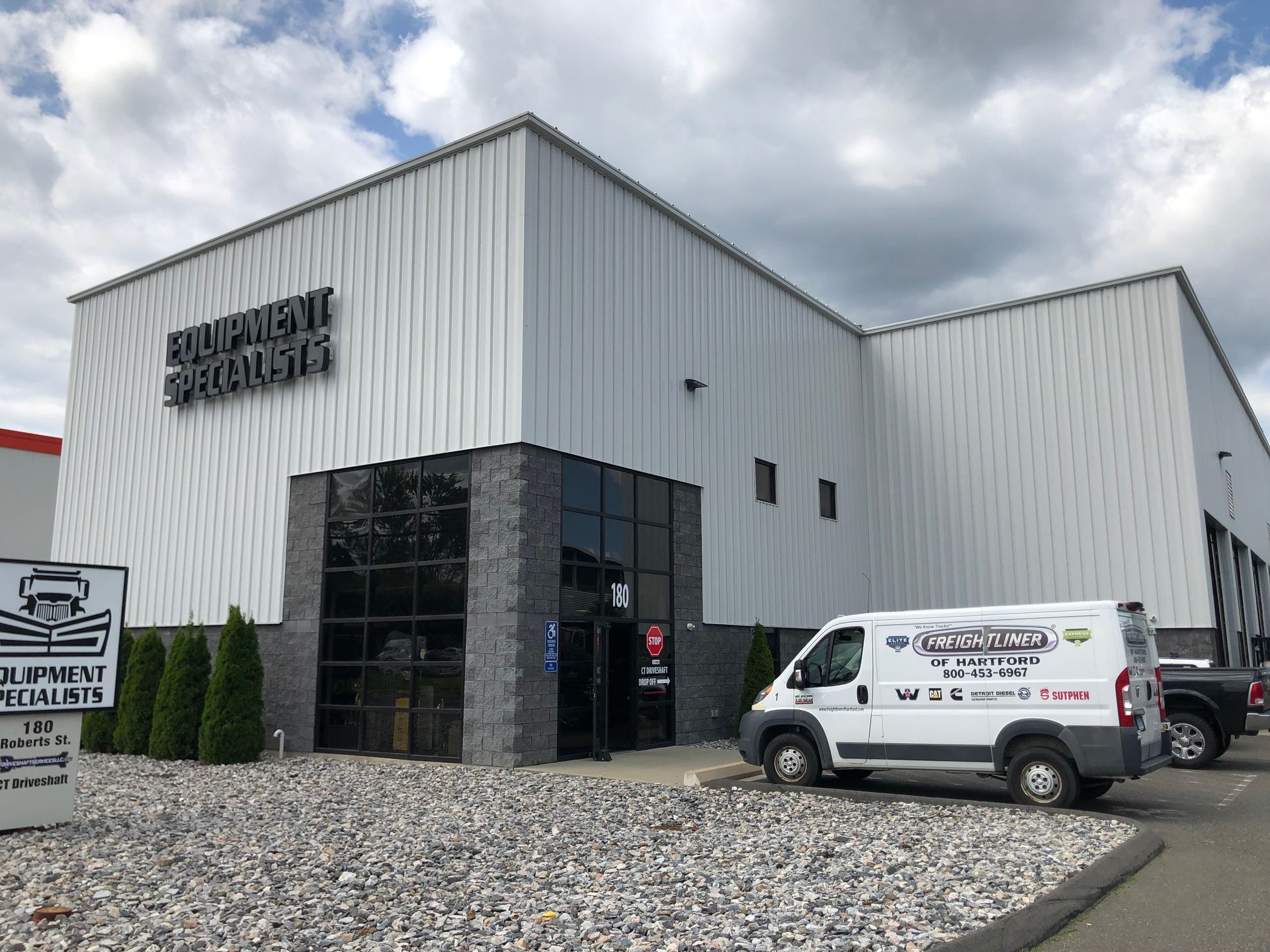 - This building has a 34’ high eave that slopes to the rear of the building. The two story office exterior features two 11’x 16’ high glass curtain walls with 16’ high split-face masonry veneer with standard-face accent bands pilasters on either side of the windows that lets plenty of natural light into the showroom/ parts area. There are also two 4’x 3’ windows at the mezzanine office/ parts area. The remainder of the shop/ maintenance areas has a 7’-4” high split-face masonry with standard-face accent band and Butler “Shadowall” ribbed metal panel above.