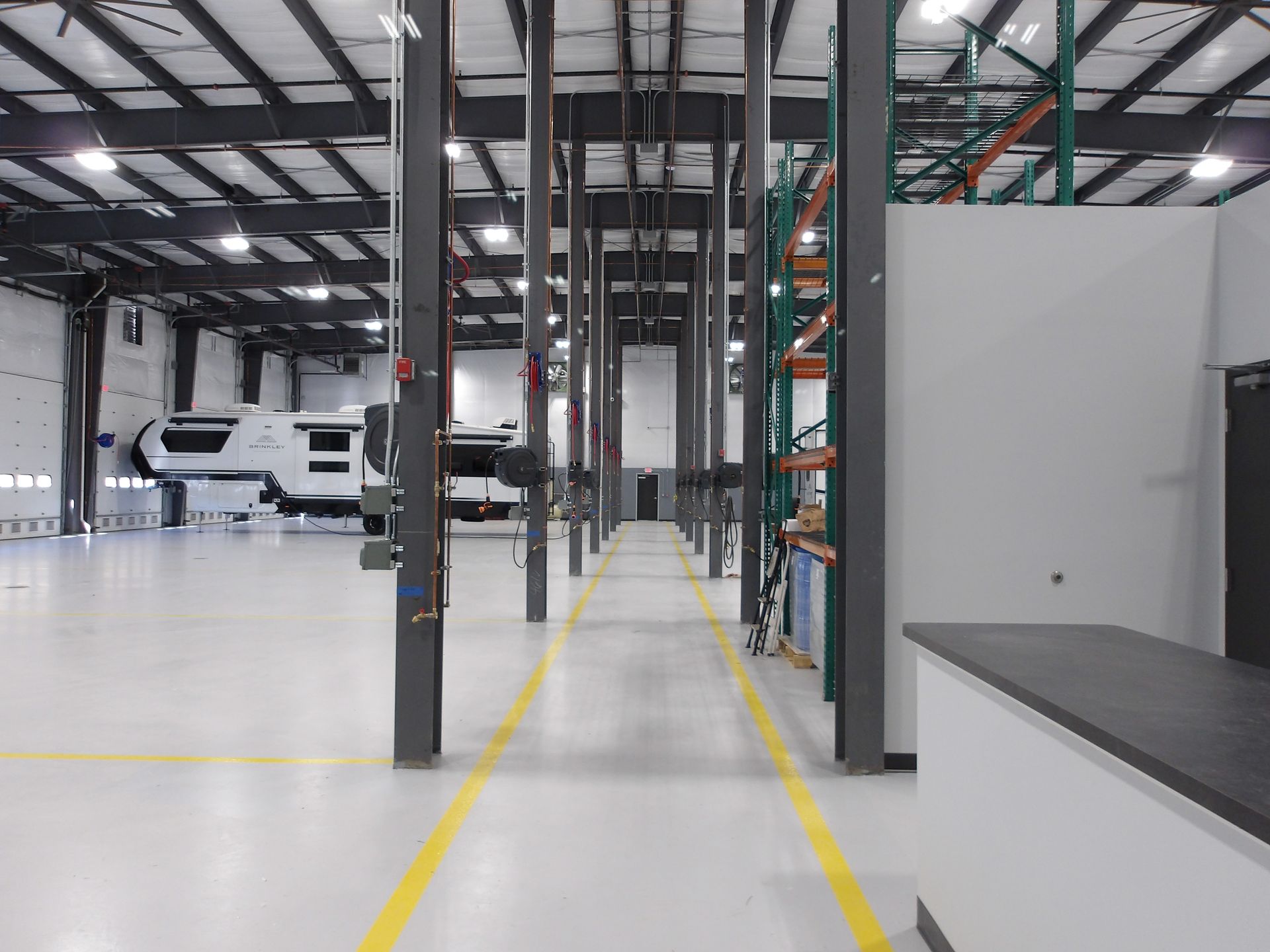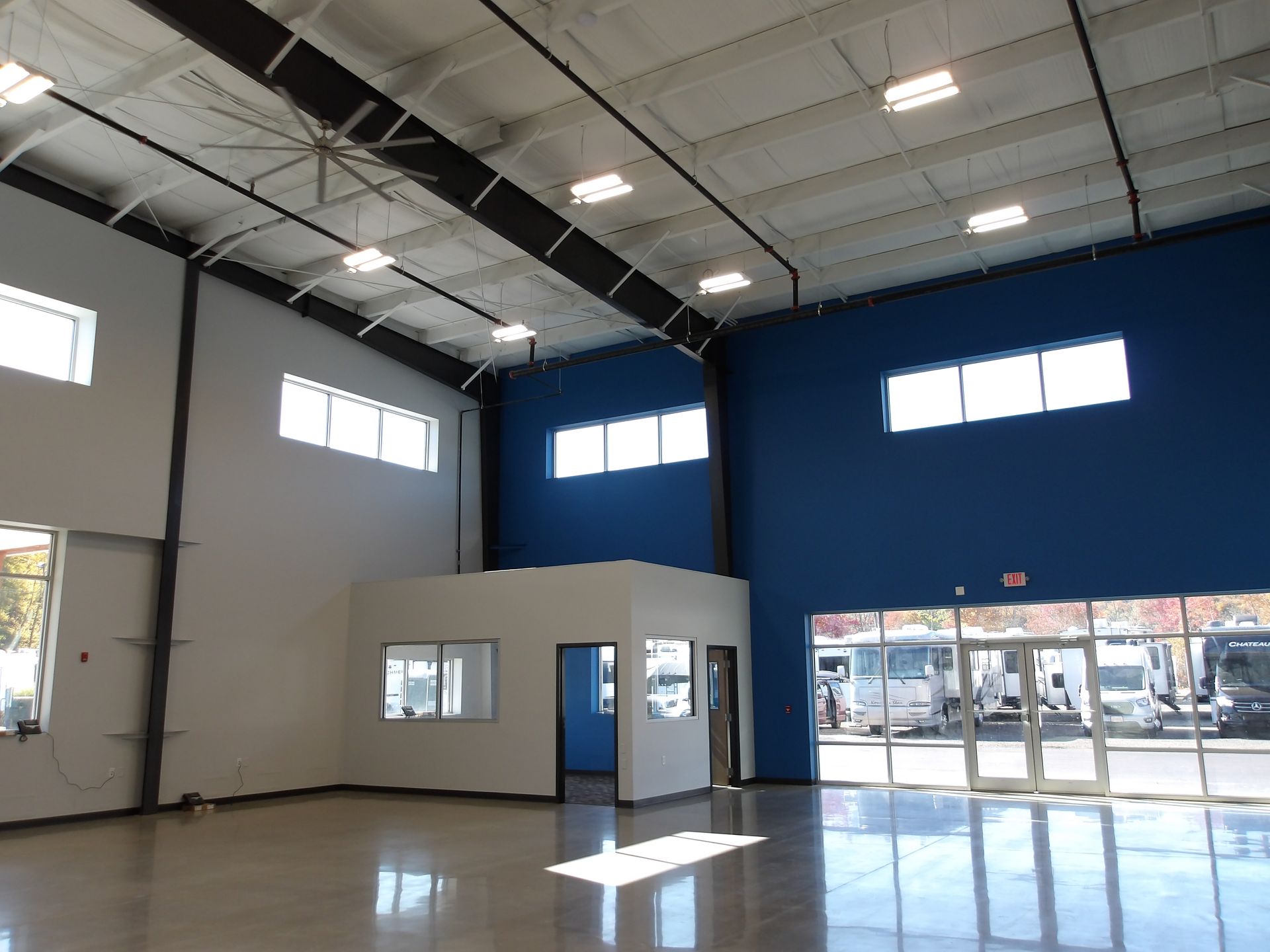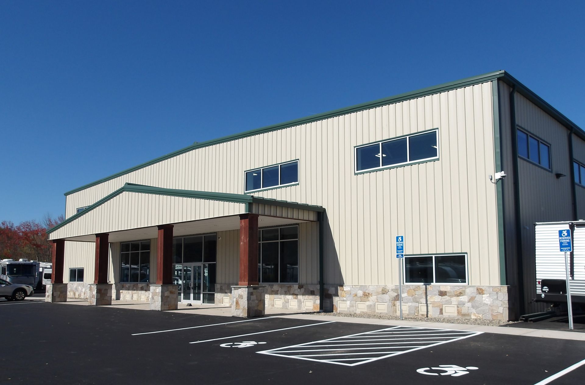 - This building is a 26’ high eave height building with a two story sales/ office/ retail portion. It features a large 60’x13’ gable end canopy supported by stone veneer and rough sawn wood columns at the showroom entrance with large floor to ceiling window units to let plenty of natural light into the showroom/ parts counter area. The showroom exterior walls feature a 3’-6” high culture stone veneer with metal ribbed panel above. A standing seam metal roof covers the entire structure. The remainder of the shop/ maintenance bays have a 26 high ribbed metal panel. There are sixteen 12’x 14’ overhead doors to allow large trailers and motor-homes to be serviced.