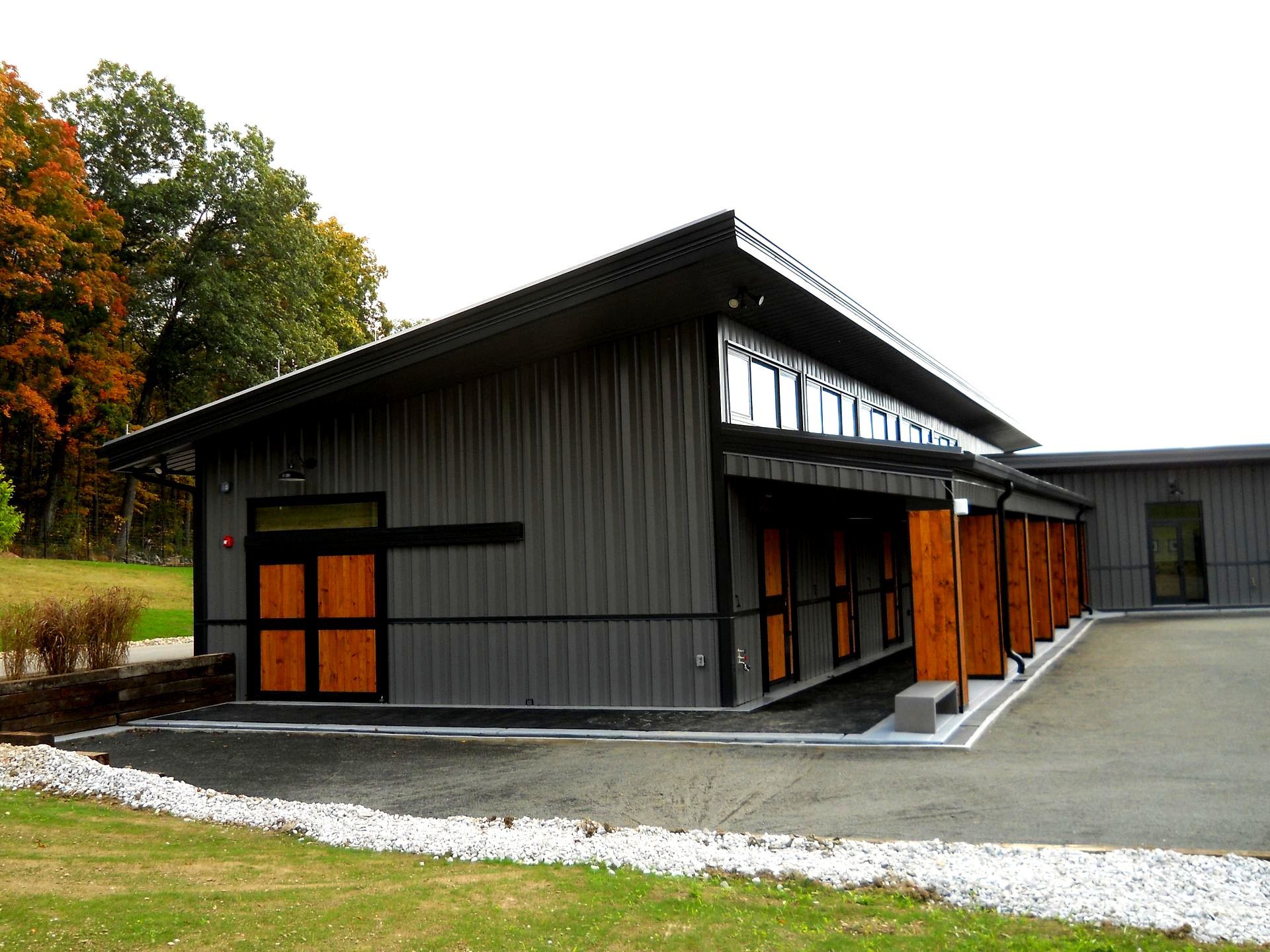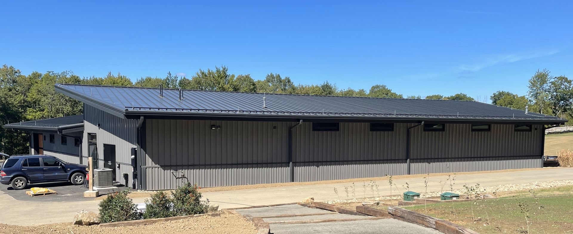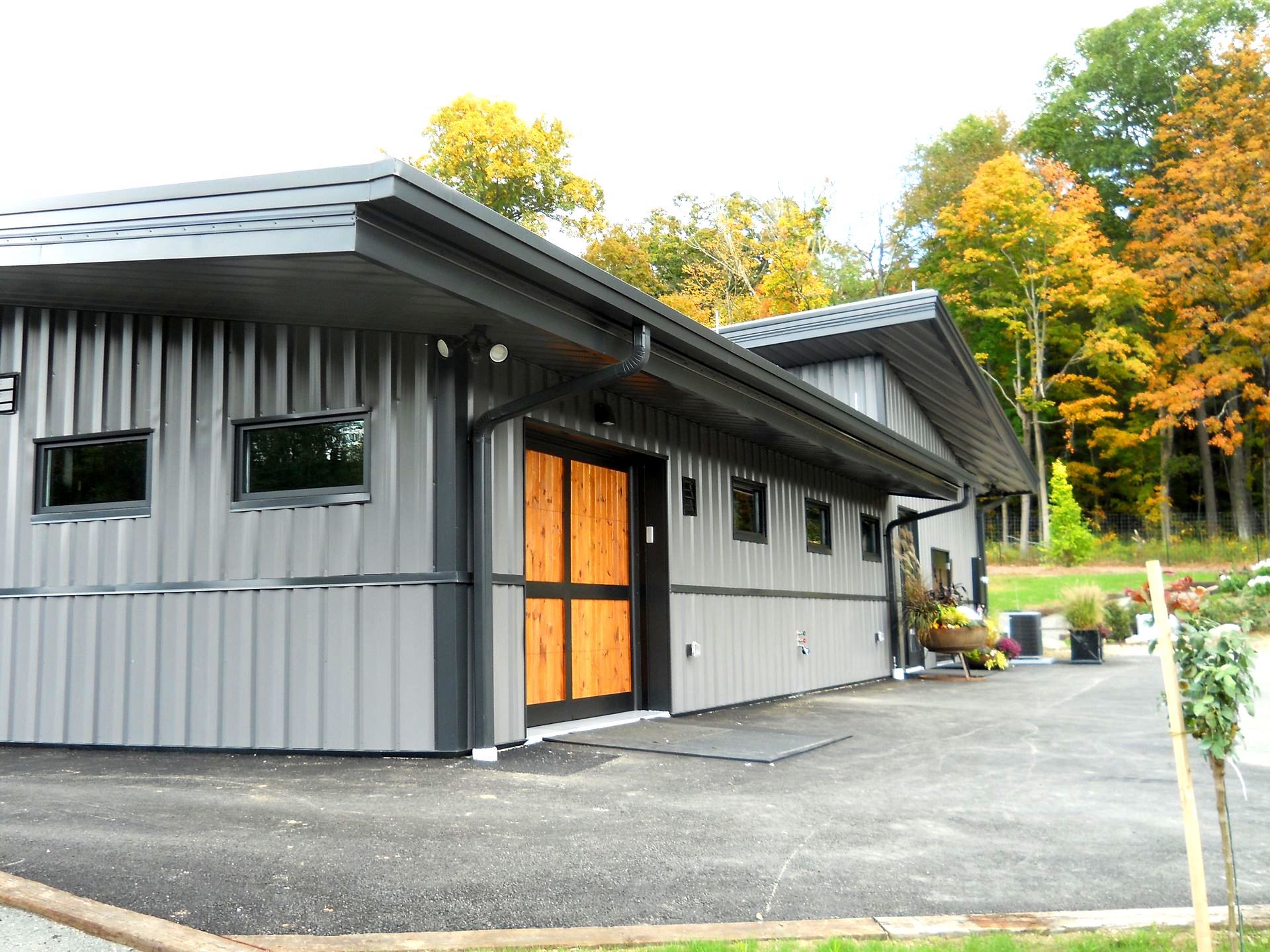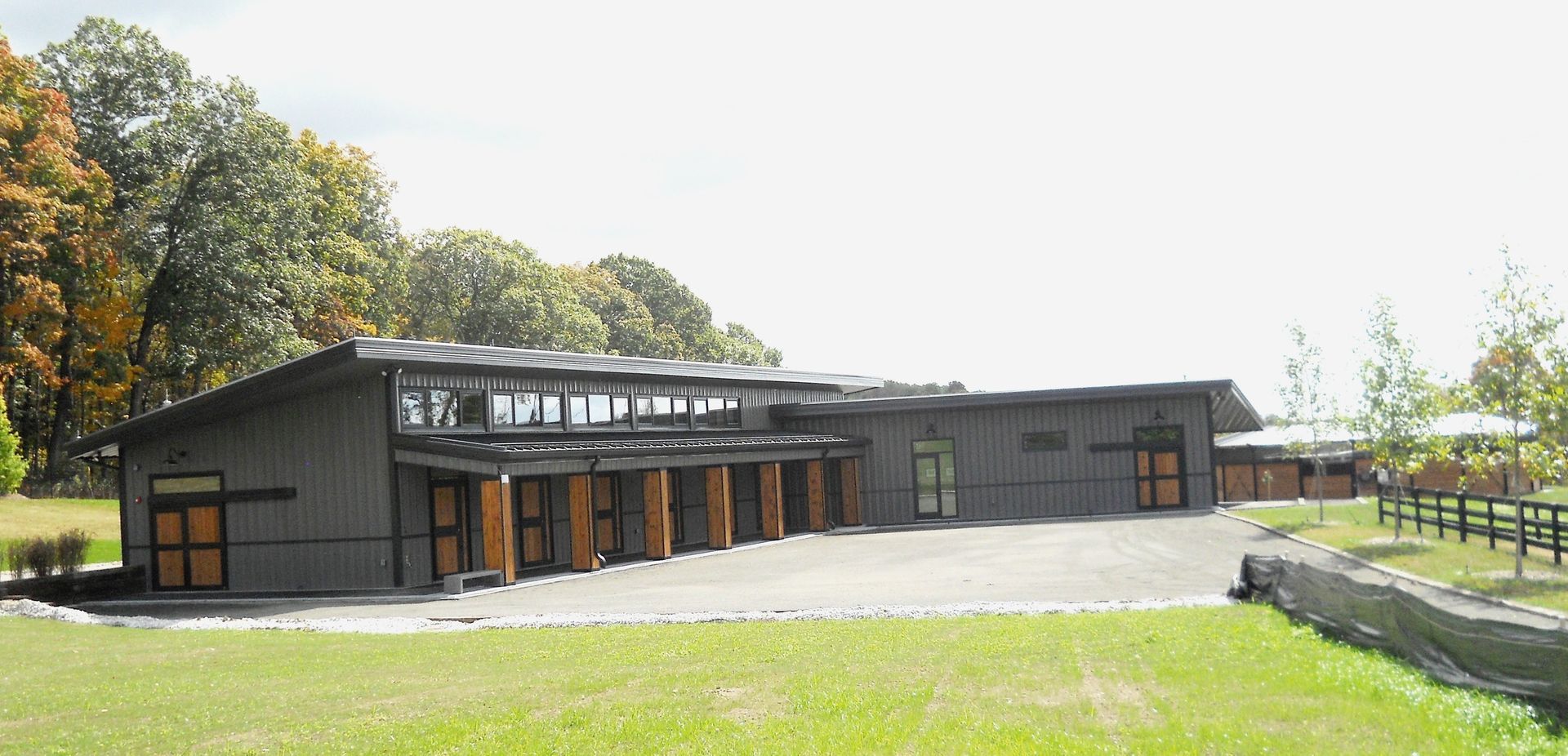 - This building has a 2:12 single slope standing seam metal roof with a low eave of 14’ and a high eave of 24’. It has a 10’ deep metal roof canopy supported by wood clad columns that runs along the full length of the six sliding stall door entries. There are two large wood sliding doors to allow large items access to the building. Above the canopy are high mounted 3’ continuous band window units to let plenty of natural light into the horse stall area.