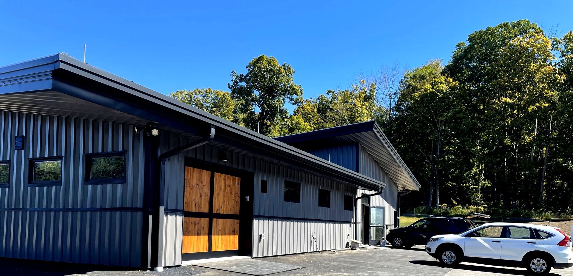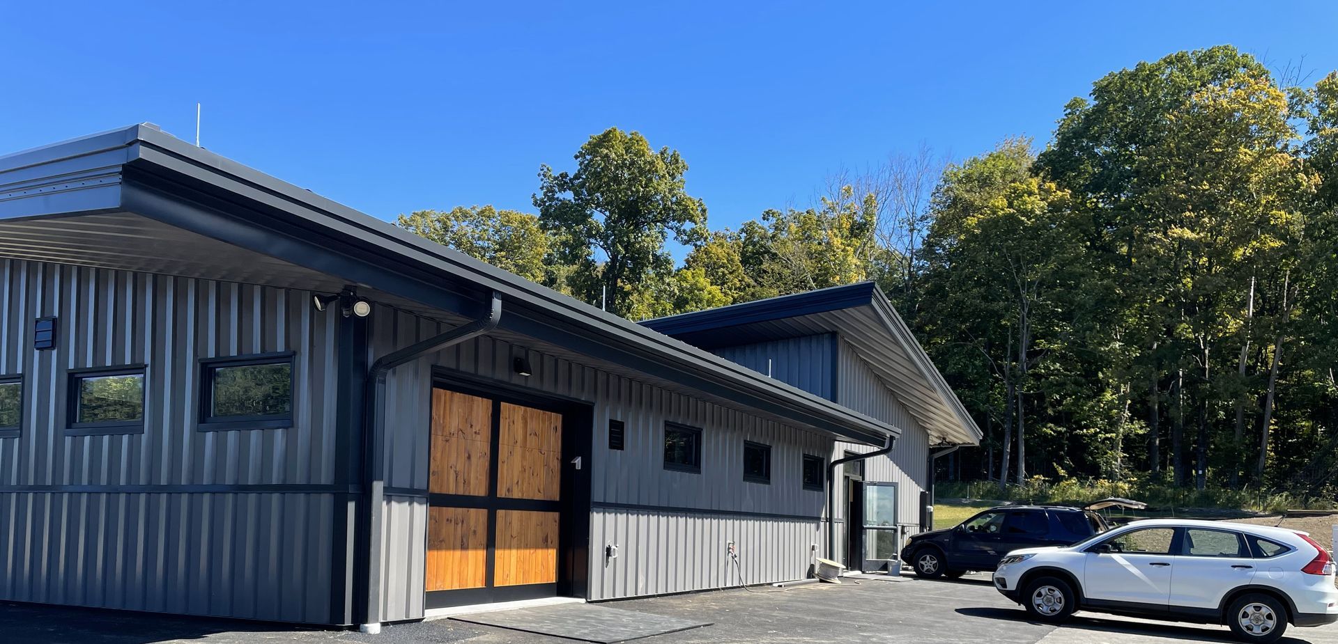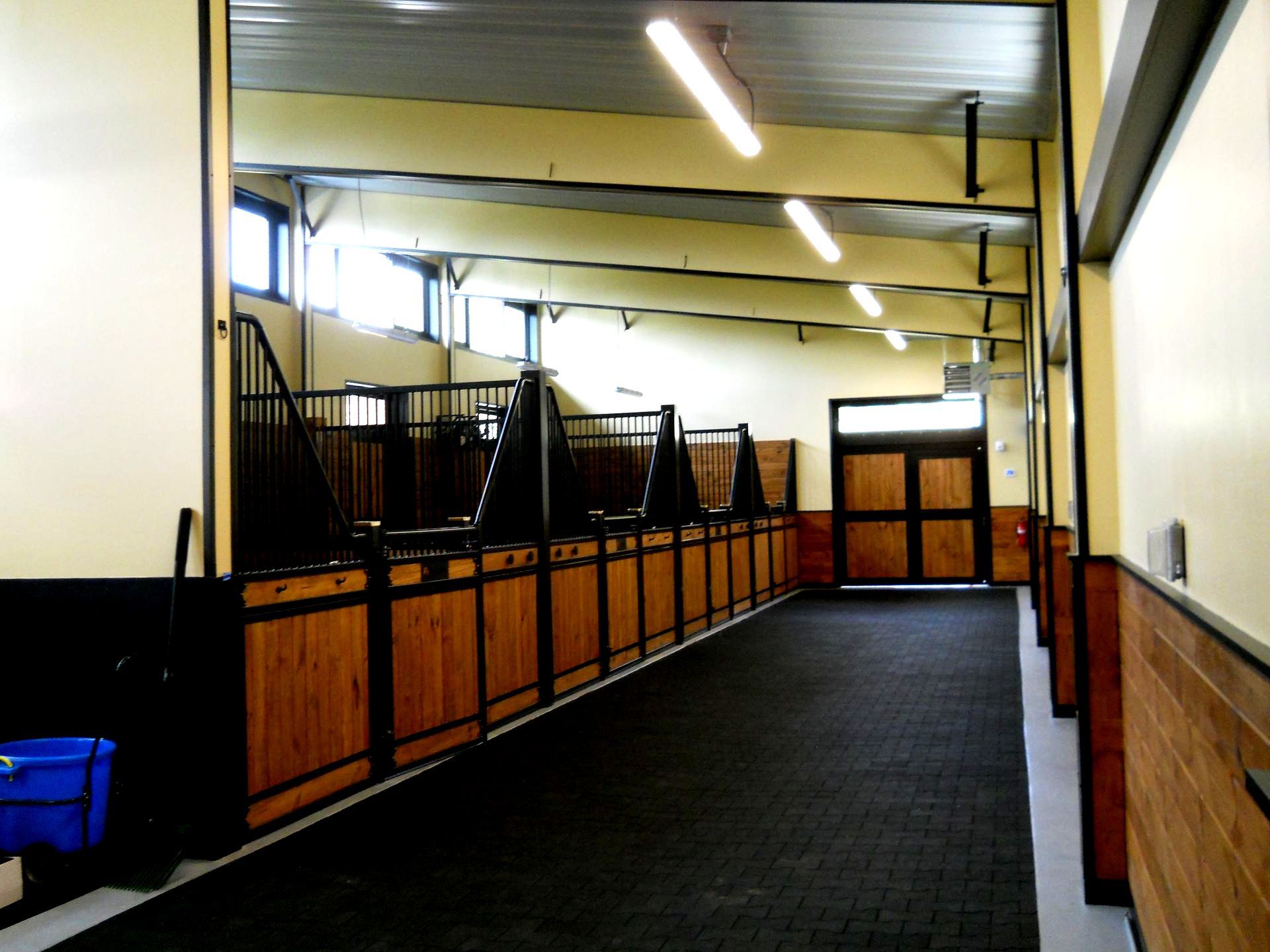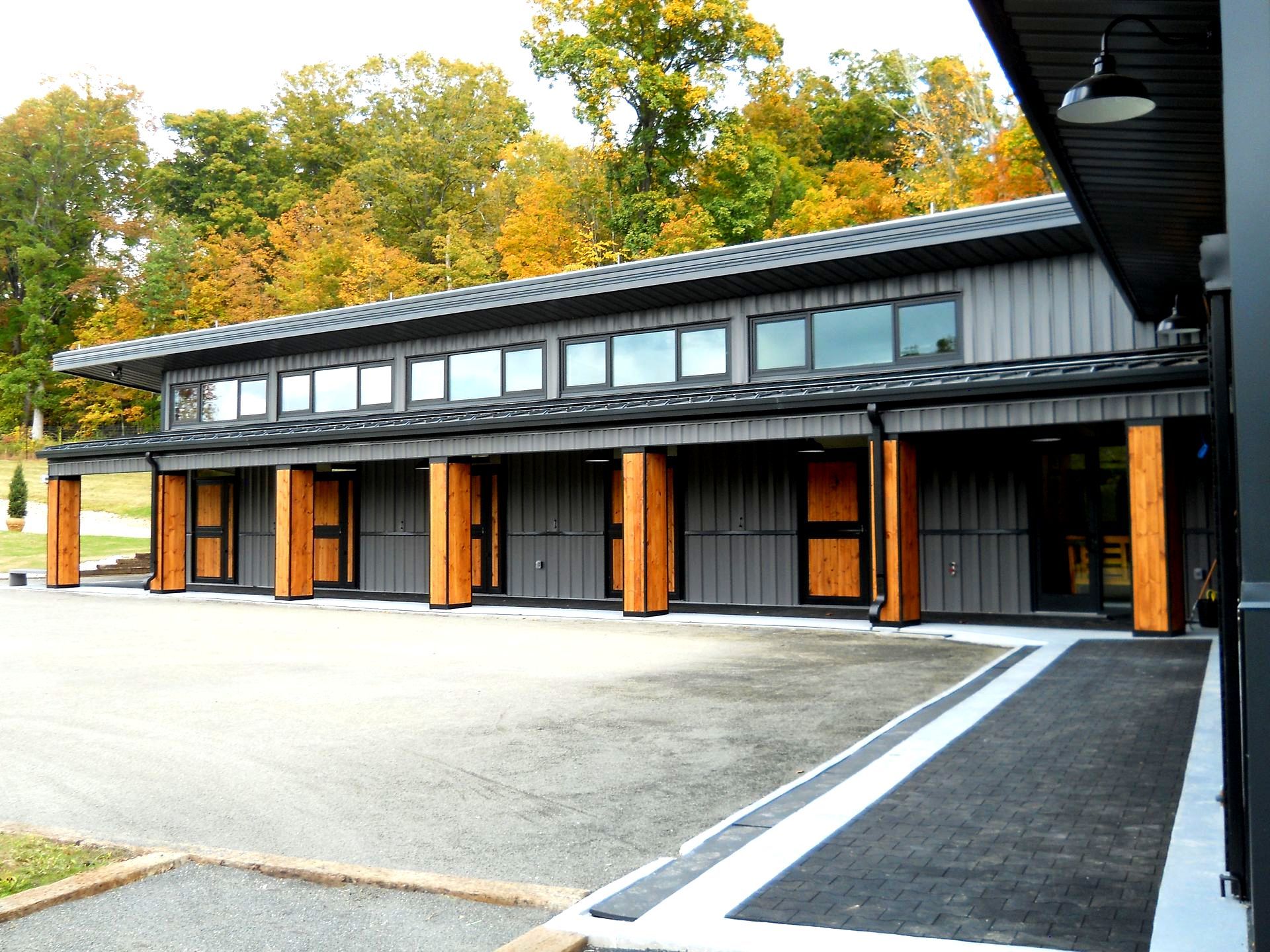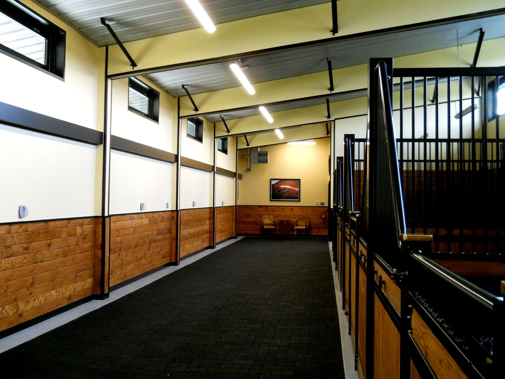 - This building has a 2:12 single slope standing seam metal roof with a low eave of 14’ and a high eave of 24’. It has a 10’ deep metal roof canopy supported by wood clad columns that runs along the full length of the six sliding stall door entries. There are two large wood sliding doors to allow large items access to the building. Above the canopy are high mounted 3’ continuous band window units to let plenty of natural light into the horse stall area.