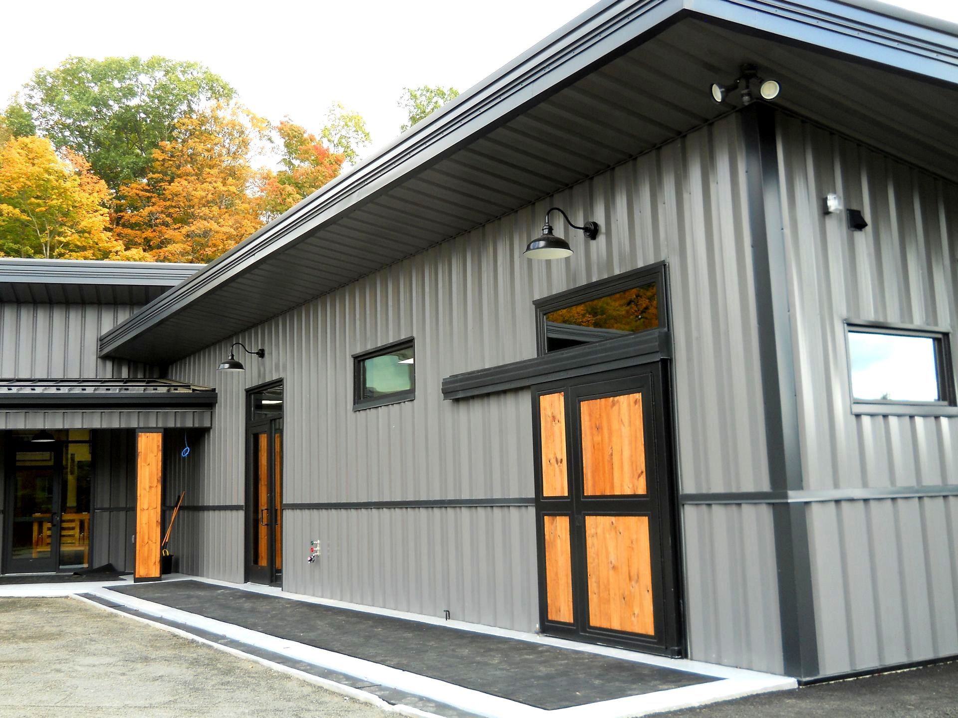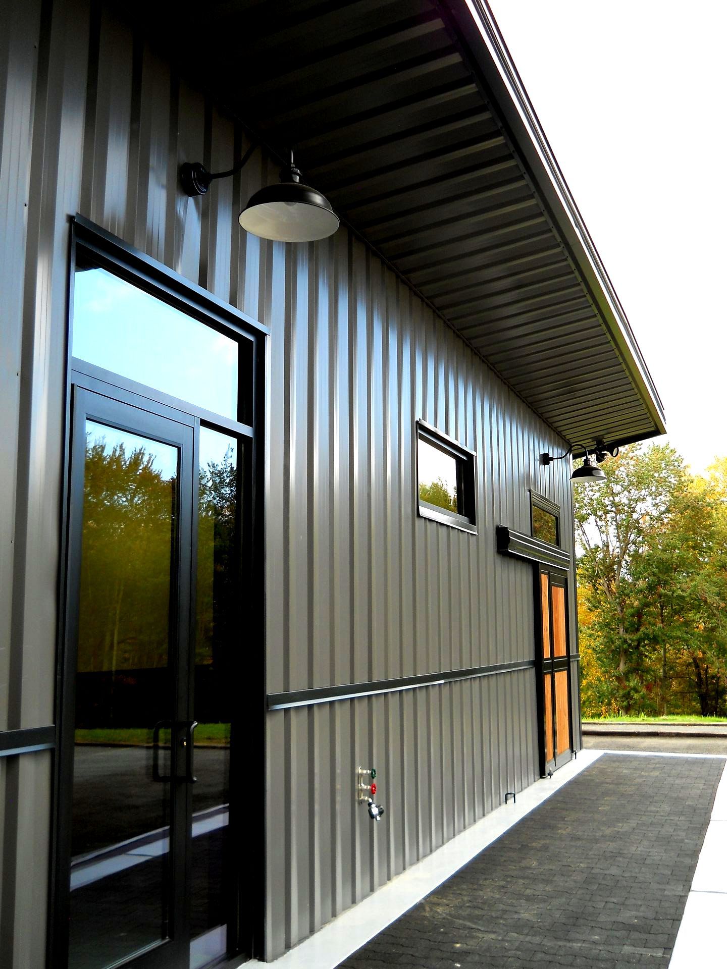- The exterior walls are metal ribbed wall panels. The contrast of stained wood sliding barn doors and dark gray metal wall panels and black trim offer a pleasing rustic/ modern look.