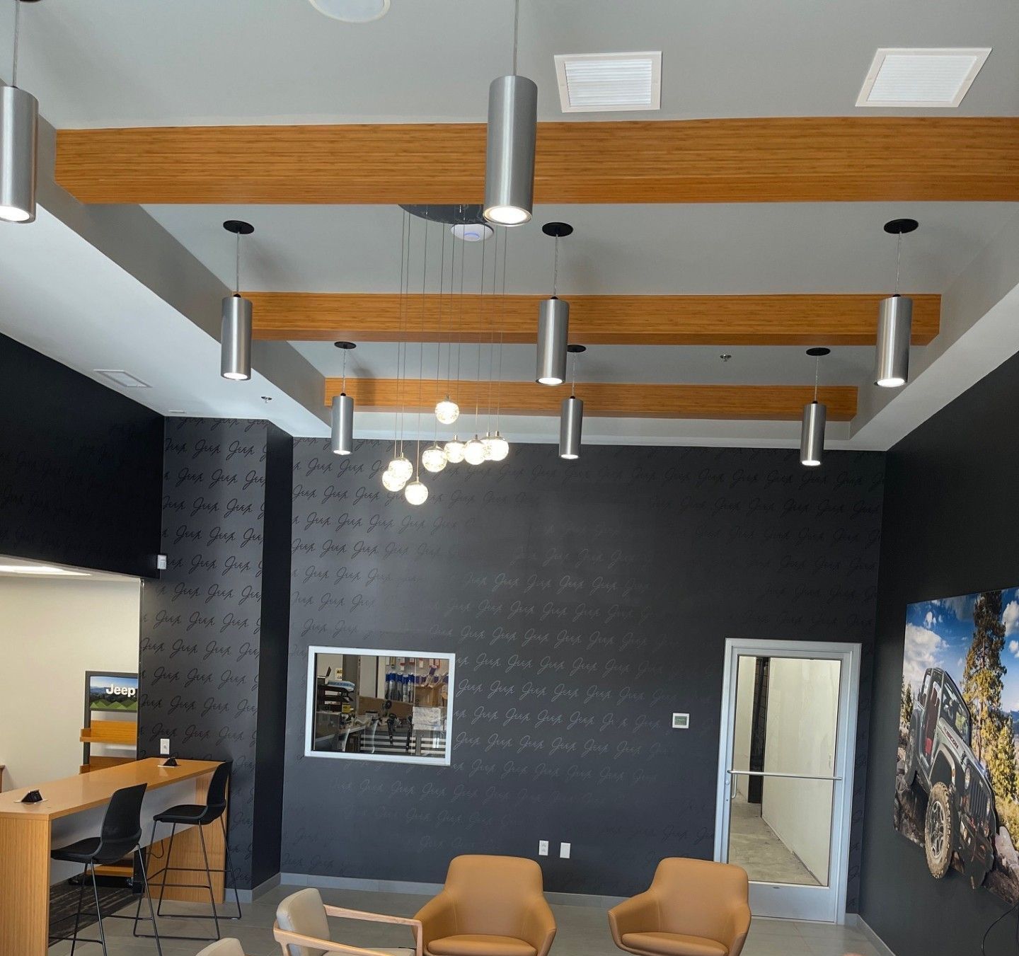 - The showroom exterior has varying height from 10’ to 27’ A.C.M. wall system with 12’ to 20’ high showroom windows to let plenty of natural light into the showroom area. The exterior C/D/R side of the showroom features an arched framed palladium style atrium at the showroom entrance. The exterior Jeep side of the showroom features a beveled frame wood frame around the 12’ high glass showroom entrance and 12’x 6’ chrome finished canopy. There are many of floor to ceiling windows in the business and showroom offices to also add natural light in.